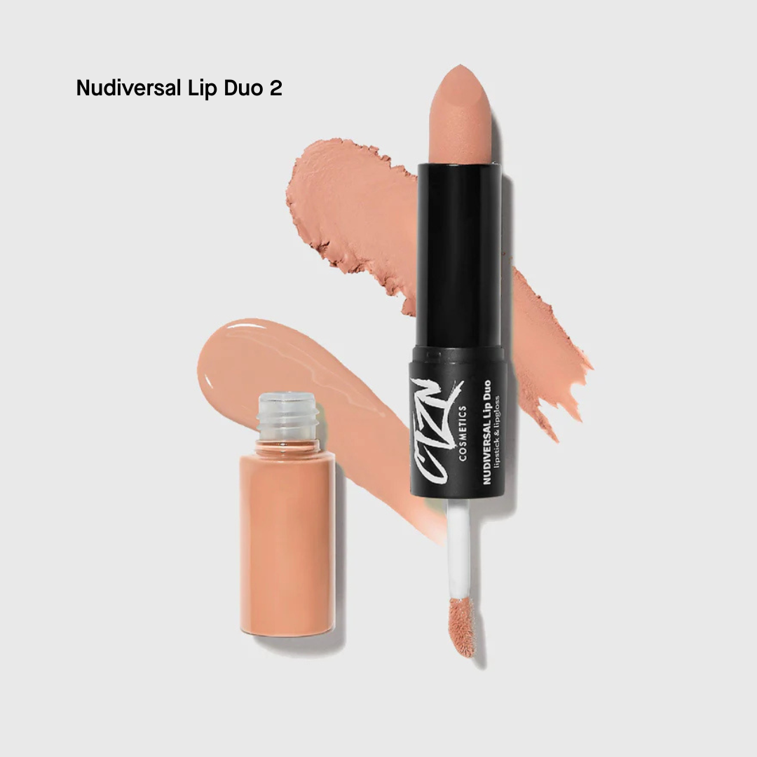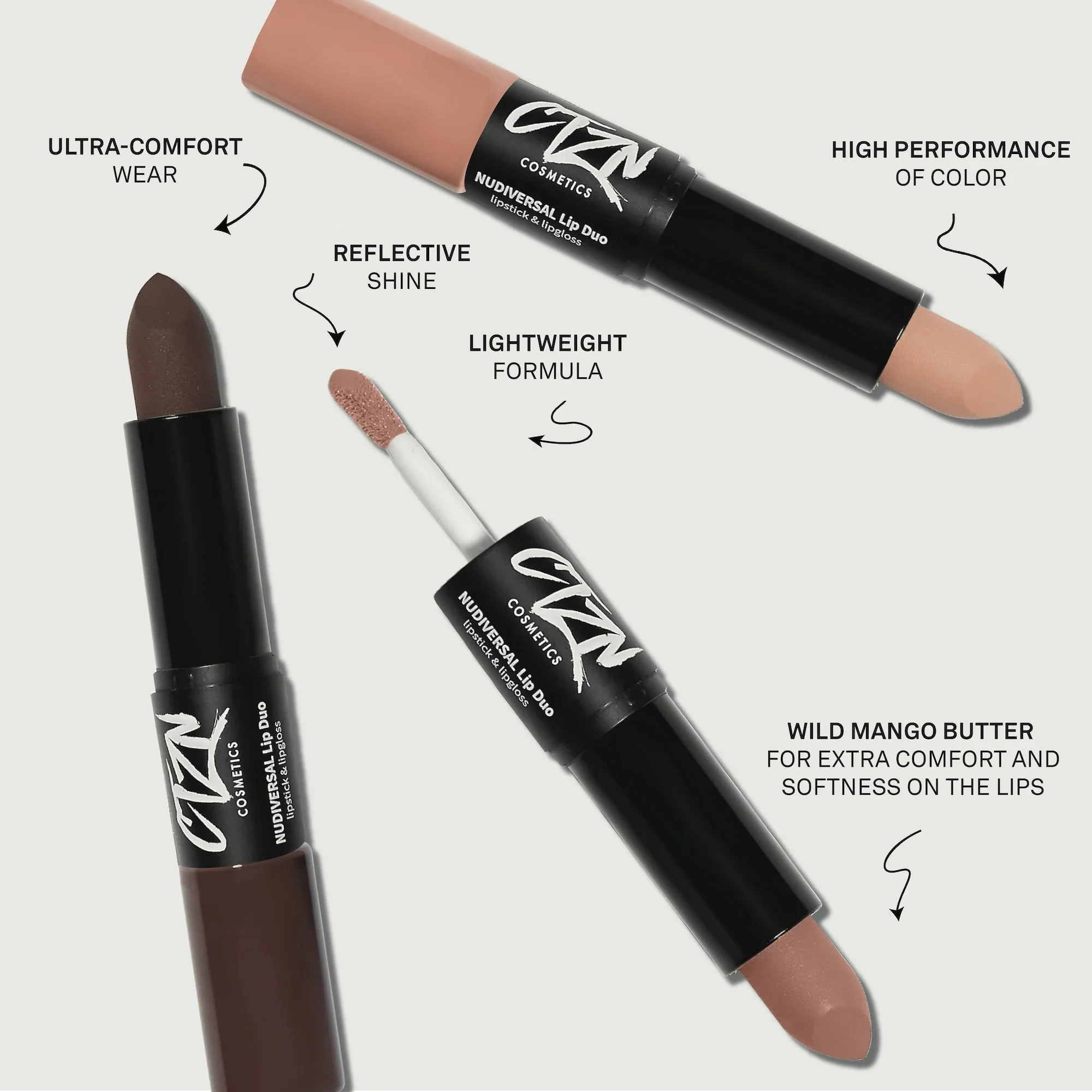 Doar doi pași vă despart de buzele cu cel mai seducător aspect. Rujul 2 în 1 CTZN Nudiversal Lip Duo are un capăt cu ruj matifiant care îmbracă buzele într-o textură mătăsoasă, cu aspect catifelat și un capăt cu luciu de buze care conferă strălucire reflectorizantă și o culoare grozavă. Infuzat cu unt de mango, produsul menține buzele hrănite, în timp ce le repară și le protejează de stresul climatic. Purtate împreună sau separat, rujul și luciul de buze oferă un aspect de invidiat și completează perfect orice machiaj.