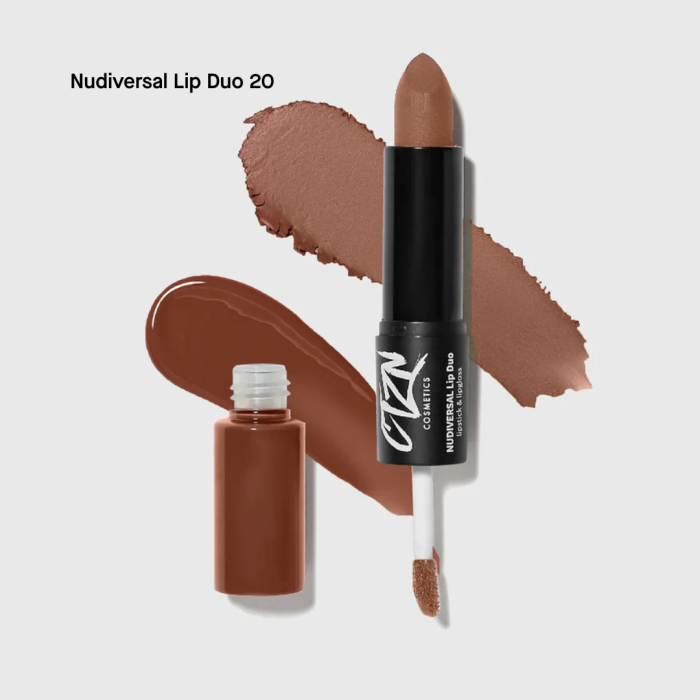 Doar doi pași vă despart de buzele cu cel mai seducător aspect. Rujul 2 în 1 CTZN Nudiversal Lip Duo are un capăt cu ruj matifiant care îmbracă buzele într-o textură mătăsoasă, cu aspect catifelat și un capăt cu luciu de buze care conferă strălucire reflectorizantă și o culoare grozavă. Infuzat cu unt de mango, produsul menține buzele hrănite, în timp ce le repară și le protejează de stresul climatic. Purtate împreună sau separat, rujul și luciul de buze oferă un aspect de invidiat și completează perfect orice machiaj.
